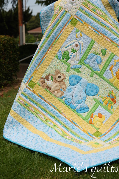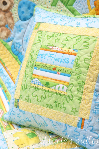 В прошлом году, я сшила парочку одеял (Первые друзья и Первые друзья 2) из одной коллекции тканей. Но так получилось, что не использовала все, что было. Это одеялко последнее и сшила его из остатков тканей. Размер небольшой – 100 х 103 см. Идеально подойдет новорожденному. В комплект идет наволочка 35 х 35 см.