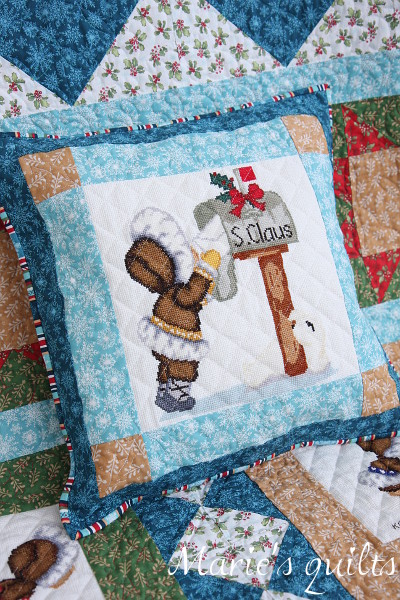 Работа была не простой, поскольку вышивки были не одинакового размера и пришлось попотеть, чтобы собрать все воедино. К одеялку были сшиты и 2 наволочки размером 40 х 40 см. Таким образом вся вышивка, которую я получила нашла свое место в этом комплекте.