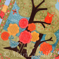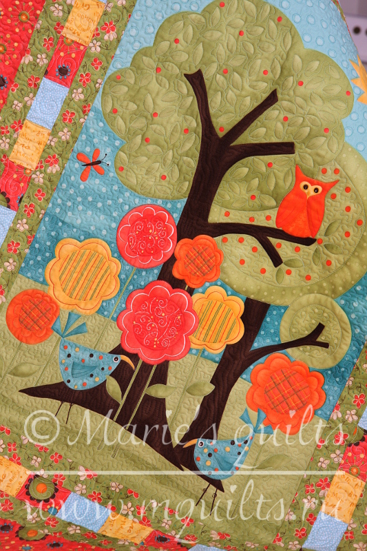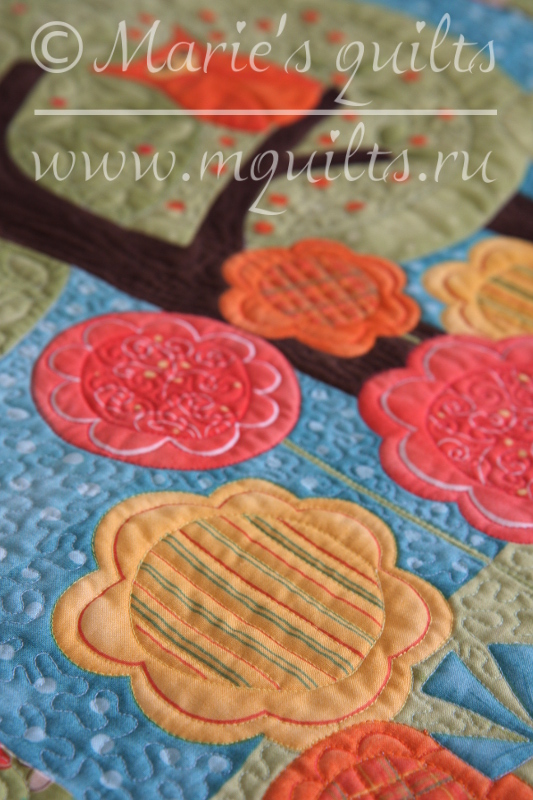 В принципе ничего сложного, но оно такое яркое и радостное. Прямо душа поет, когда смотрю на него. Стегать заполняющей стежкой не стала, а повторяла рисунок панели, чтобы выделить его. По-моему получилось чудесно! От панели у меня остались небольшие квадратные фрагменты с рисунком. Выкидывать их было жалко, поэтому они превратились в лоскутные наволочки!