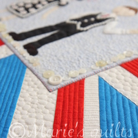 Само панно должно было быть не большим (размер работы 49 х 74 см) и поэтому самой сложной задачей было найти пуговицы. Самые маленькие какие мне удалось разыскать, были диаметром 5-6 мм. Для украшения платья и жилета, у меня ушло 100 пуговиц, не считая бисера. Что касается фона, то для него я использовала британский флаг. На рамку вокруг аппликации, было израсходовано 120 пуговиц перламутрового и белого цветов.