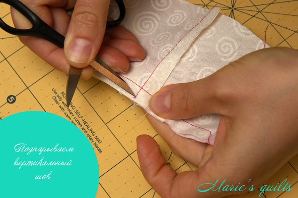 И еще один момент… раскрытие шва. Покажу еще раз поближе. Острыми ножницами, подпарываем вертикальный шов до горизонтального. Делаем это с двух сторон.