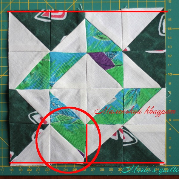 Здесь несколько ошибок. Первую я думаю вы уже видите… Блок не совсем ровный и это видно по направляющим и моим красным линиям. Кроме того, обведенный красным квадрат — маленький и неровно пришит. Я специально провела для вас вертикальную прямую, чтобы вам было лучше видно. Очень у многих швы при сшивании элементов не одинаковы по всей длине. Это также ведет к искажению блока. Не верите? Покажу еще раз. Верхний ряд сшит верно, а второй – нет.