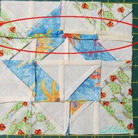 Обратите внимание на правый верхний угол. Про этого участника хочу сказать отдельно. Она весь блок сшила без линейки, коврика и ножа. Кроя и подрезая только ножницами!!! Во как!! И не смотря на это, не теряет надежду сшить блок без единой ошибки. Вот еще один пример. Здесь также виден завал блока на одну сторону.